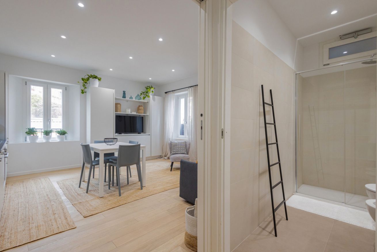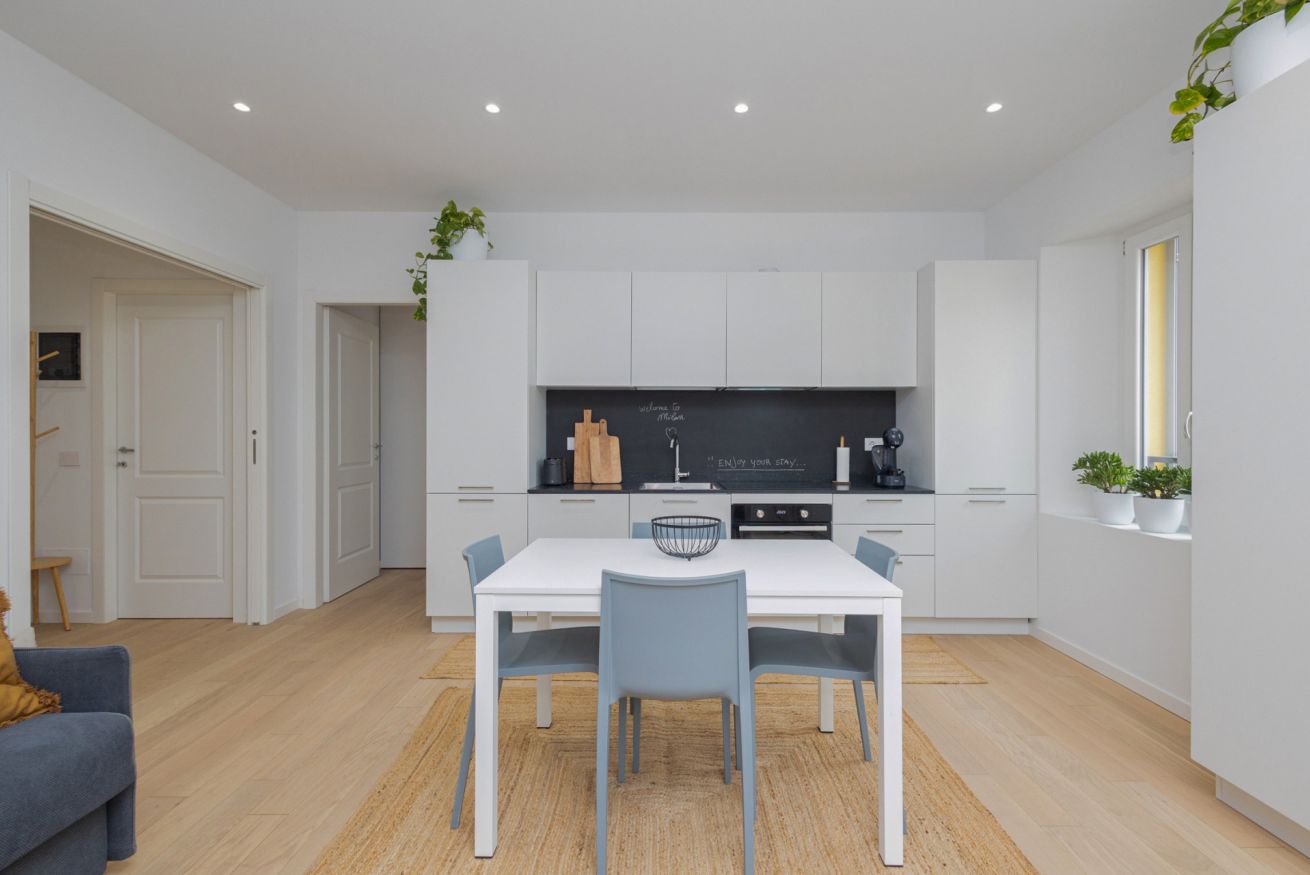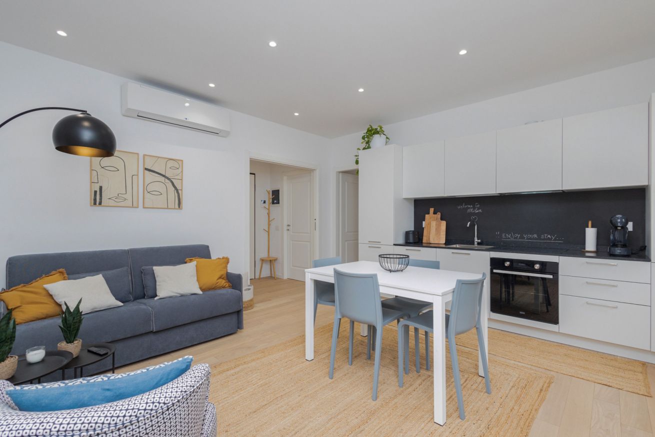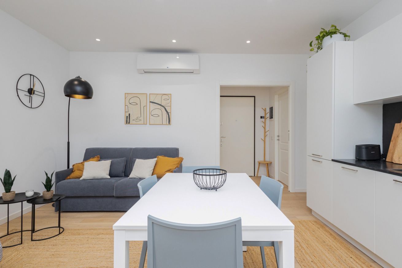 Finemente rifinito, arredato con materiali di pregio e corredato con elementi di design, è composto da: ingresso su ampio e luminoso soggiorno con cucina a vista completa di tutti gli elettrodomestici, soggiorno con divano e Smart TV, camera da letto matrimoniale, divano letto due posti, bagno con doccia e lavanderia con lavatrice e asciugatrice.